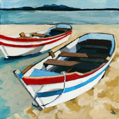 Colorful wooden boats. “Fraternal twin” to Boat with Red Stripe. Same size, same palette, similar but different.