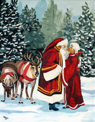 Winter scene featuring a couple dressed in traditional Santa Claus and Mrs. Claus attire. They are standing close together in a tender embrace, with a snowy forest as their backdrop. The forest is adorned with tall evergreen trees heavily laden with snow. A pair of reindeer, also clad in festive gear, stands to the side, completing the idyllic holiday atmosphere. The color palette predominantly uses tones of red, white, and green, evoking a warm, festive feel against the cold winter setting.